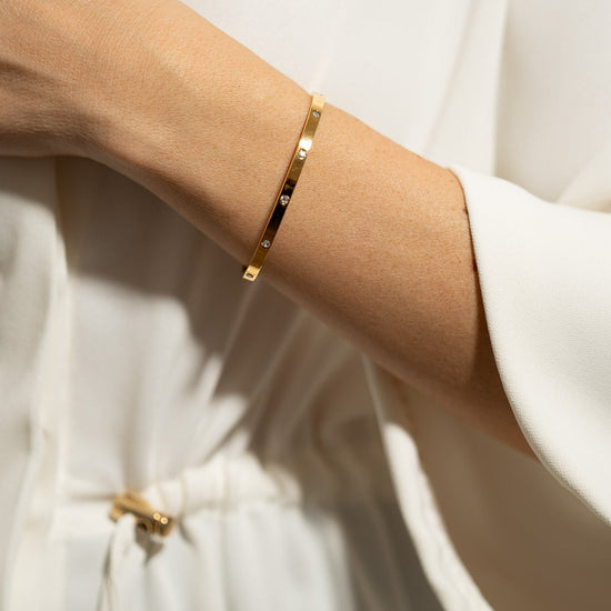 Our Desiderio bangle is made of hypoallergenic stainless steel . The bracelet is water resistant , does not tarnish, and maintains its shine over time. Lightweight and comfortable to wear, it is designed to accompany you every day with style and durability in any situation.