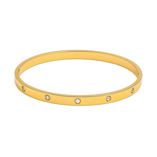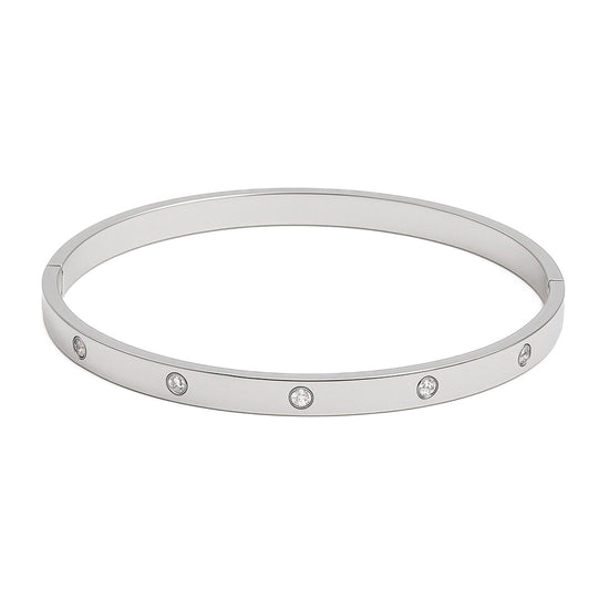 Rigid bracelet in stainless steel , characterised by a smooth and shiny surface, enriched by small luminous zirconias arranged with balance and discretion.